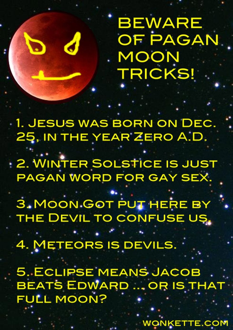 Tonight will be very exciting for the fancy elitists in our country who can locate the night sky: For the first time in four centuries, a total lunar eclipse will also mark the Winter Solstice. Also, it's a Full Moon! And there's a meteor shower tonight, too! This combination of science and paganism is exactly what the Baby Jesus fears the most this time of year -- and America can hardly afford to have its national religious-consumer holiday spoiled by potentially Islamic forces of Nature. As always in our fragile nation, the crucial thing is to not bedistractedby what's going on all around us, because the American Way is to instead create some unpleasant diversion until "the threat passes" or everyone currently alive is dead. That's why we've prepared this handy chart to help you prepare for tonight's astronomical violence.