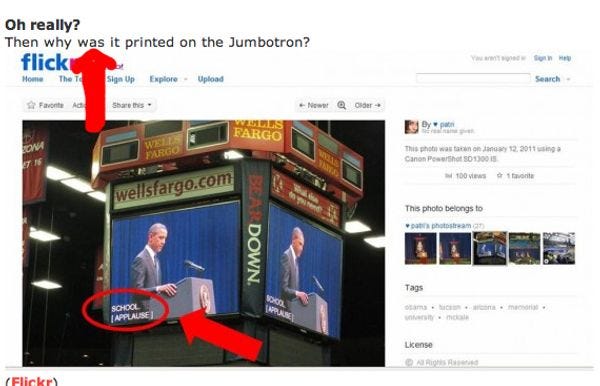It has taken some time, but Gateway Pundit figured it out! We now know why those rowdy, unassociated college kids whooped and cheered every time they heard the words "University of Arizona" ("mourning"), at the memorial in Tucson last week: The president's Jumbotron told them to applaud! It certainly couldn't be that these wingnuts don't understand the concept of closed captioning, right? Oh.