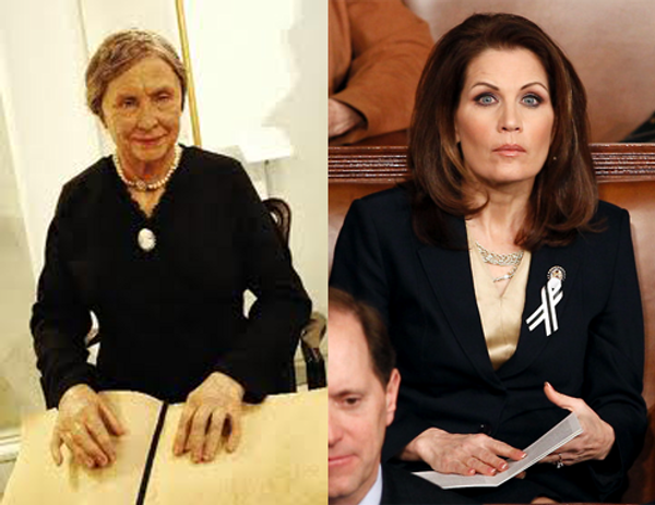 For a comparison, here is Bachmann next to a wax figure of Helen Keller. Just look at the eyes and pose; try to ignore the fact that the wax figure looks more intelligent and stately. And human.