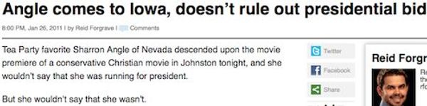 Honestly, Sharron Angle in Iowa? And honestly, a reporter and editor writing this story and putting it in a newspaper and on the Internet as if this was a potentially true thing, that Sharron Angle -- someone so crazy that she couldn't even beat Harry Reid, in Nevada, in 2010 -- thinks it's an "option" that she could run for president? Can we please skip straight ahead to 2013?