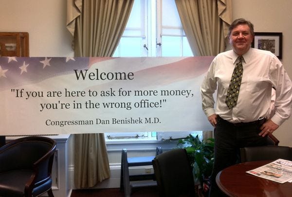 This is apparently going to hang in the reception area of Rep. DOCTOR Dan Benishek's congressional office, to warn visitors he may eat their briefcases and papers and will be wearing a short tie that's just as cheap and ugly as this banner. [ Facebook ]