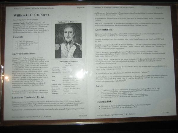 Might somebody who works for the government of Louisiana have some access to verified information about their first governor? Apparently not. Yeah, just tape that Wikipedia page up next to the statue! That works! Looks pretty classy-like!