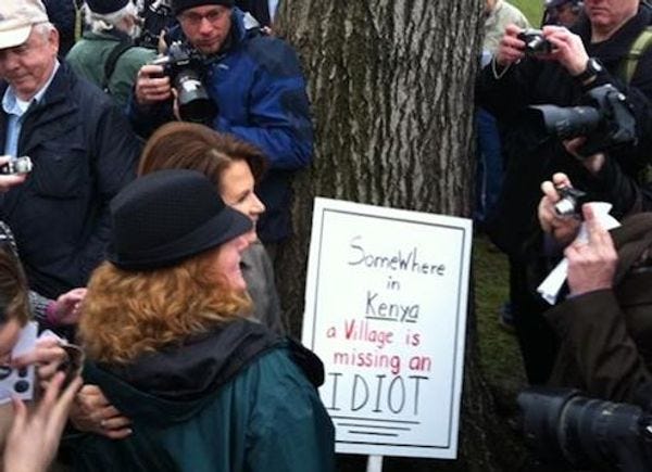 Jabbering fucktard clownfish Michele Bachmann was one of the twelve or so teabaggers to "protest" in Washington today, by utterly failing to have a protest. But at least she posed with this sign announcing that she had escaped from Kenya, and that this strange white suburban wingnut village in Kenya was now missing its main idiot. Then Michele Bachmann walked into a tree and thanked George Washington for ending slavery and writing the bible, the end. [ Dave Weigel's Twitter thing ]
