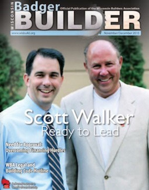 Anyway, Scott Walker is all about JOBS, especially (specifically) if you give Scott Walker's campaign a couple of sacks of money. Because Scott Walker will make that money go to work for you, if you are the person who paid the money to Scott Walker. Jerry Deschane of the Wisconsin Builders Association got Maximum Value out of the $121,652 he handed to Scott Walker: Not only does the Wisconsin Builders Association now have somebody on the payroll in charge of "environmental and regulatory matters," but that same drunken failure kid is alsoearning$81,500 from Wisconsin taxpayers. Score! [ JS Online ]