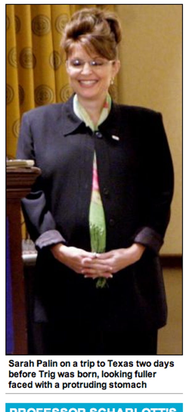 We got a 29-page paper by a Kentucky journalism professor a publicist was sending around early this week that purported to shed light on the truth of Trig Palin; that he is, in fact, Bristol's son, which is a rumor that started at her high school and was then picked up by mean girl Andrew Sullivan. Now, COINCIDENTALLY, the Daily Mail is out with a photo they say was taken two days before Trig was born and shows a Sarah Palin as happily rotund as the people who buy her books. Is this the smoking gun? Of course not. If Sarah Palin gave birth to Trig, why hasn't she shown us the placenta?