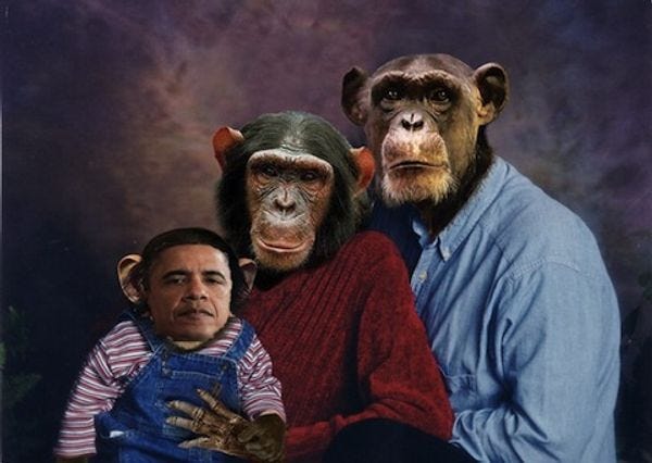 Haha, black people are monkeys! This is how jokes work! But everybody loves cute monkeys, so it's not racist.