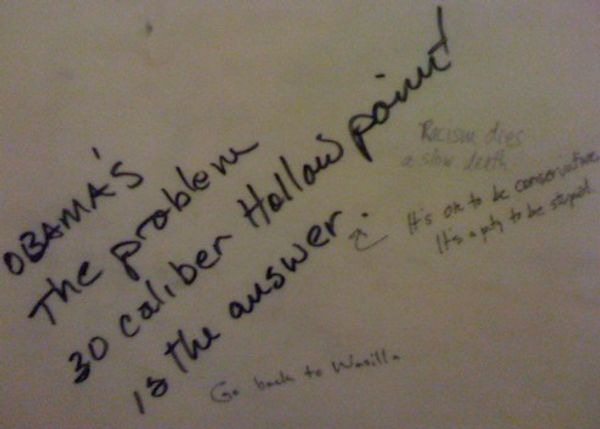 As for the person who thinks it's "okay" for people to want the president to be murdered with "cop killer" bullets -- you know, being "conservative" -- therealproblem is neglecting to punctuate the end of the graffiti scrawl with a period. So this free-lance copy editor adds a period to the end of the second sentence, but not the first sentence ("OBAMA'S The problem"), and the random use of upper- and lower-case letters along with the extremely bad spelling/penmanship resulting in "Hollow poiwt" is simply ignored. "Stupid" is relative in Alaska.