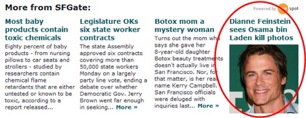 Wonkette operative "Matt" sends us this screengrab from SFGate.com. Is the reason the U.S. government doesn't want us to see the bin Laden photos is that he's too handsome ? Americans aren't going to be grossed out by them. They're going to join up with Al Qaeda to gawk at all the pretty, ageless gentlemen.