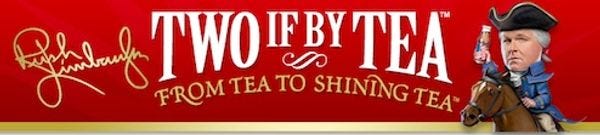 On Rush and Kathryn’s wedding night, Kathryn said to him – “Rush, why don’t you put your mug on a tea beverage dressed up in colonial costume including a wig with a bow and a tricorn hat, riding a frightened-horse, holding a bottle of tea with an American flag on it?” As she was pouring over historical poems and references in her galloping mind, Kathryn said, “We should call it Two If By Tea™ !” Rush said, “Ok!”