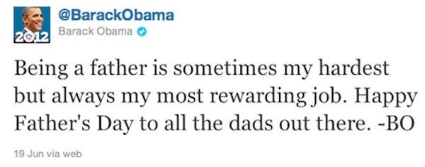 Barry Obama from the Block finally got around to installing the Twitter application on his Blackberry this weekend, probably after John Boehner mocked him at their Golf Summit for running around without it. The president's account to date has been filled with dry robot White House staffer tweets that made Chuck Grassley's Twitter feed look like a Saturday night swinger marathon. Can you spice it up, hip Obamar? No, is the answer. "Being President is not as hard as being a father" was his first tweet. Nice one, most boring person on Twitter ever. We're glad "body odor" can let everyone out there who is a parent know that it is harder than running the world. Could we have that job leading Earth, then? Obama also apparently likes that job better than being President, which, now our feelings are sort of hurt?