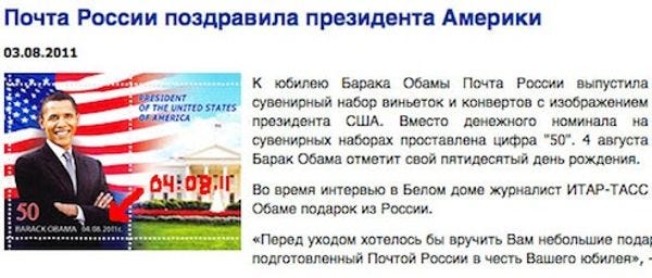 Russia’s Post Office has issued a collection of stamps and envelopes to mark the 50th jubilee of the US President Barack Obama.