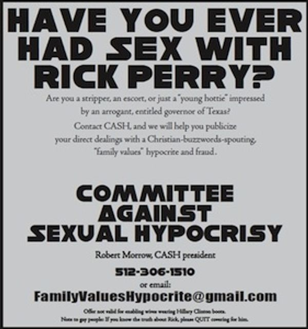 Morrow claims that he knows strippers in Austin who have stories about Perry, but none of them are willing to come forward to the press; hence, the need for an ad in the Chronicle. "I think it's only a matter of time until somebody credible comes forward," he told me.