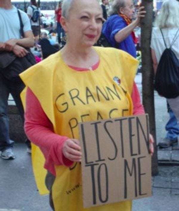 Here are some righteous elders (the self-described "Granny Peace Squad") telling a Fox News teevee crew that they're not afraid of getting curb-stomped by the cops, even though they're very fragile: