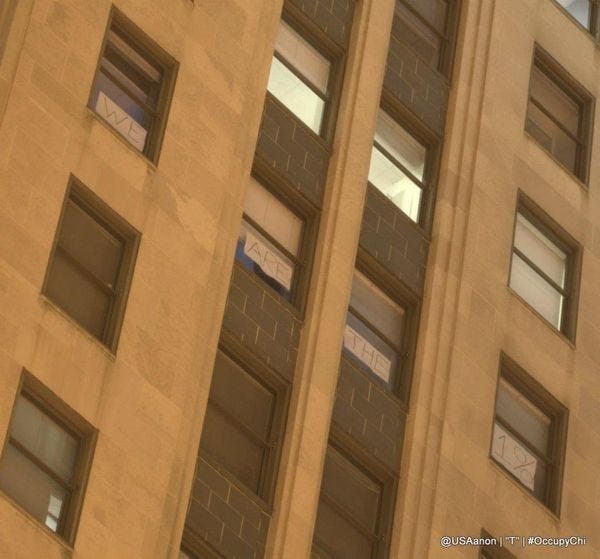 The Occupy Chicago protester-folk got this cryptic message from the mysterious cabal of mutant space hamsters inhabiting the Chicago Board of Trade. But, uh, maybe take heart Ocupados (?), the 1% does not even appear to have enough money to buy printer ink to run off a couple of window signs, so they will join you soon enough.