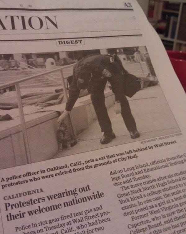 Faced with endless photographic documentation of the insane violence of 500 riot cops against a group of protesters in Oakland, theWashington Posteditors proved they are good Kaplan 1% corporate lackeys and choose this picture of ... a riot cop petting a kitten. Not justanykitten, though. According to theWashington Post, the shameful excuse for a newspaper in the nation's capital, it's a kitten that was cruelly left there by the evil protesters. Hooray for the cops! Protestershate kittens.