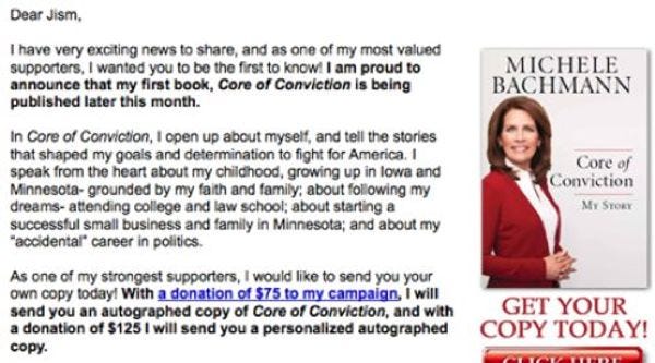 This is a screen capture from the exciting beggar's epistle that arrived in our inbox today from Michele Bachmann! See it there at the bottom, that last sentence? Right, so here's our question: does this mean Michele Bachmann would actually, personally write "Thank you, Jism! Love, Michele" in one of her vulgar vampire fiction books if we sent her $125?