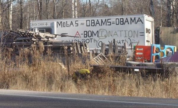 Those letters, obviously, are O, B, A, M, A and let's see, what else you need to spell A-BOM-(Is)-NATION? Who knows, ask Cindy if she comes back from Bible Community College someday.Thanks to Wonkette spy "Vladimir B." for documenting this important folk art somewhere on the back roads of Minnesota.