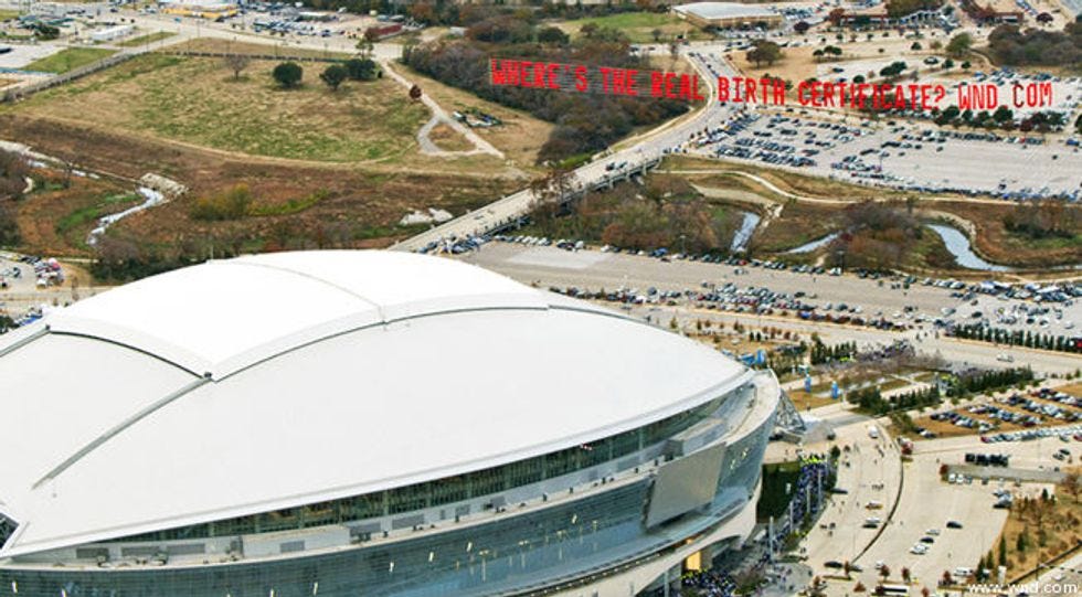The birther hobbyists at WorldNetDaily would have liked NFL fans watching some game in Texas to notice their screamy ad, but shit, who knew they've been putting domes on the professional football stadiums these days?
