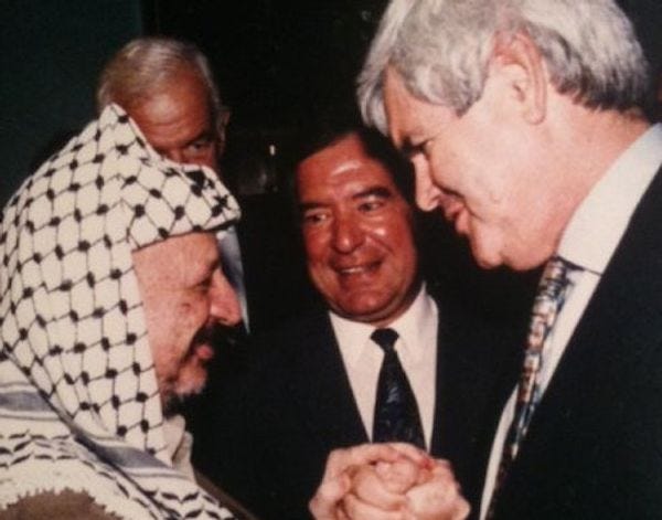 A long time ago, when amoral sperm whale Newt Gingrich was simultaneously banging another extramarital bimboandprosecuting Bill Clinton for an extramarital sexytime, Newt wasalsodeeply in love with Palestinian heartthrob Yasser Arafat.