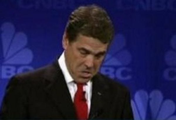 But the lasting imageis of Mitt Romney, undoubtedly smiling and looking down at his notepad of doodles while Perry driveled on. One man's gaffe is another man's pina colada by the pool/presidential nomination. [USA Today / Talking Points Memo]