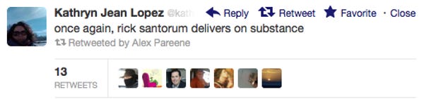 8: 40 PM -- Rick Santorum looks awfully fucking smug for a guy who just lost the evangelical wingnut vote to a thrice-married hump whale and a space-alien Mexican.