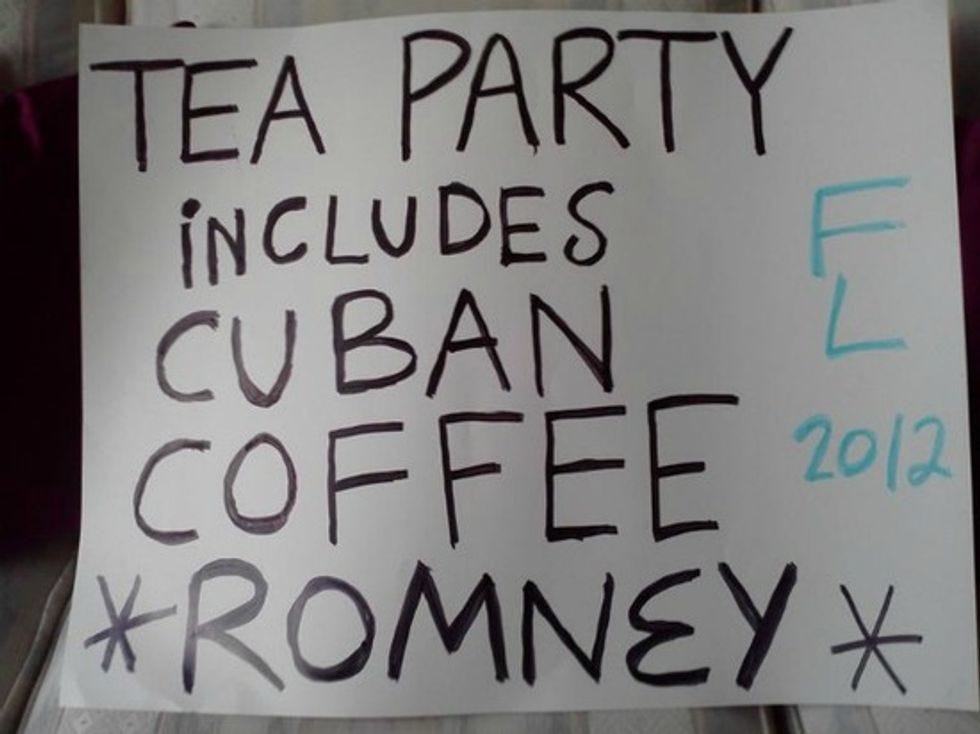 One unfortunate Mitt Romney supporter in Florida seems to have discovered a novel way of getting kicked out of a campaign event: Alan Reynolds showed up to a Mittens rally with a sign bearing the (mysterious?) collection of words, "Tea Party Includes Cuban Coffee Romney." NOT COOL, said Romney campaign staff. Because Mitt Romney does not drink coffee. It is against his magick moon religion. Therefore this hilarious nonsense phrase must be kept away from Mitt AT ALL COSTS and Reynolds was told to leave. No, we don't understand it, either! Does Mitt Romney melt away like the Wicked Witch if he so much as reads one of the special Mormon naughty words?