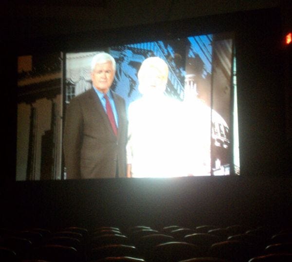 And here is the Citizens United Theatre Room, in which we watched some porno about Ronald Reagan, hosted by Newt and Callista Gingrich. We're usually ashamed of our horrendous photography but this depiction of Cally as a indiscernible blinding white monster sort of... works.