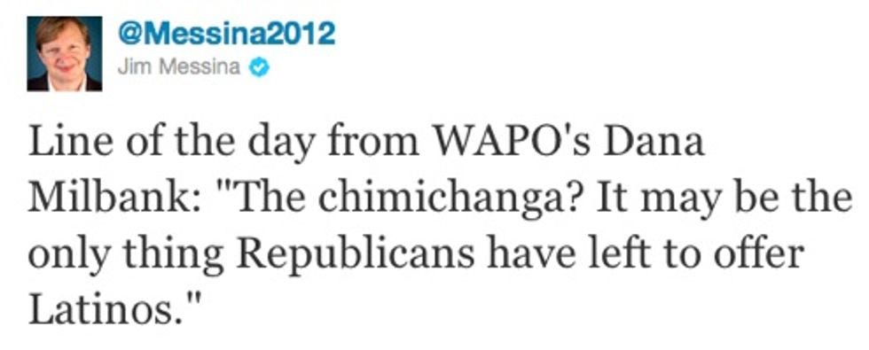 What is wrong with Barack Obama campaign manager Jim Messina, that he thinks Latinos are all about chimichangas? Latinos are all about TACOS, you moron. How racially insensitive can this guy possibly be? Let's check Messina's original comment for further outrage!