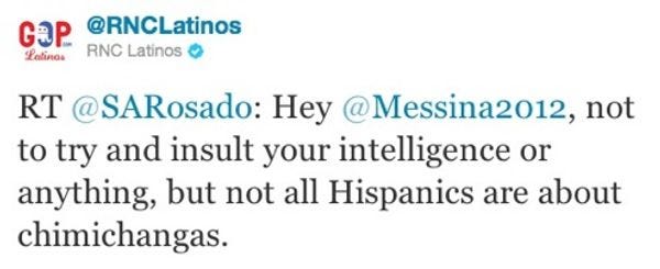 "The fact that the campaign manager of President Obama's reelection campaign thinks it's appropriate to disseminate insulting jokes about the Hispanic community is a perfect example of the kind of empty rhetoric that characterizes this White House's so-called outreach to Latinos. We demand that Mr. Messina immediately apologize and we ask that President Obama disavow his campaign manager's ridiculous statement," said Jennifer Sevilla Korn, executive director of the conservative Hispanic Leadership Network, in a statement.