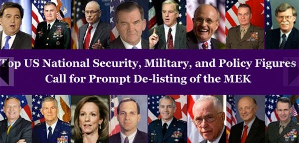 MEK is a traditionally Marxist guerilla warfare group committed to overthrowing the Republic of Iran. Since the United States government would like to see the Republic of Iran overthrown as well, it's become a top goal for rich establishment hawks to have MEK taken off the list despite its love of terrorism. The backers of this have put together an unusual coalition of politicos to advocate for the cause -- all of the Bush administration people, for example, as well as fucking Howard Dean. They all go to big MEK rallies around the world, pledging their solidarity! This may be (absolutely 100% is) considered "providing material support to a terrorist group" -- on TV -- which is a rather serious criminal violation. No one gets prosecuted, of course. That would be crass!