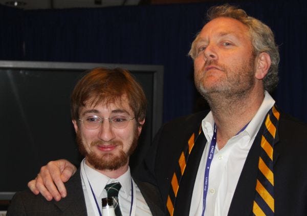 American blog owner Andrew Breitbart is dead. He was 43 years old, and reportedly died of "natural causes" in Los Angeles early this morning. We knew Breitbart -- "we," meaning many of us who have written for Wonkette, including young Riley Waggaman, pictured above at left -- and he was a pleasant enough goofball in person. Breitbart was also a talented writer of headlines (it really is an art!) who worked anonymously for many years as Matt Drudge's assistant on the West Coast. What he is known for today is the vile collection of websites that includes "Big Government," and his rambling, slurring appearances on broadcast media.