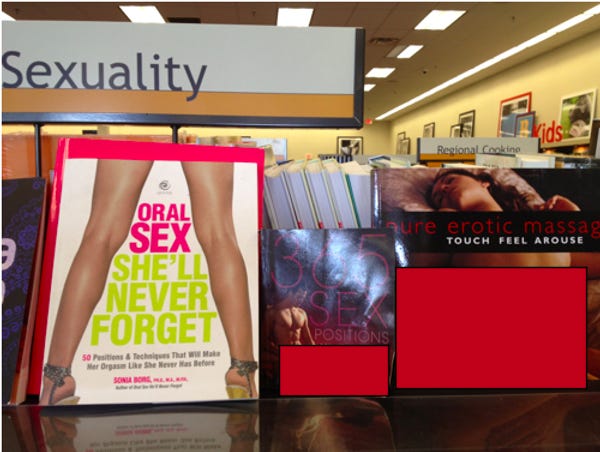 NOPE! The bookstore had put books about people having sex in their Sexuality section THEMSELVES! Blah blah blah, she calls corporate headquarters because of course she does.