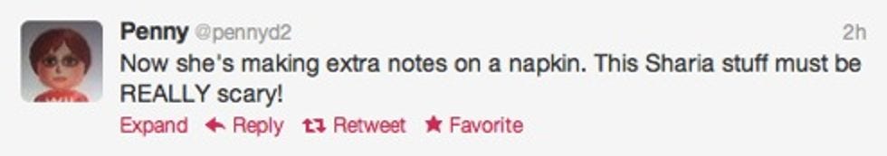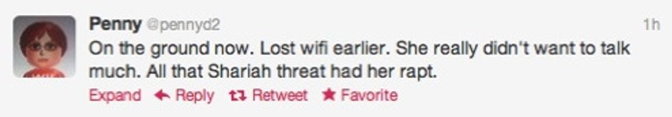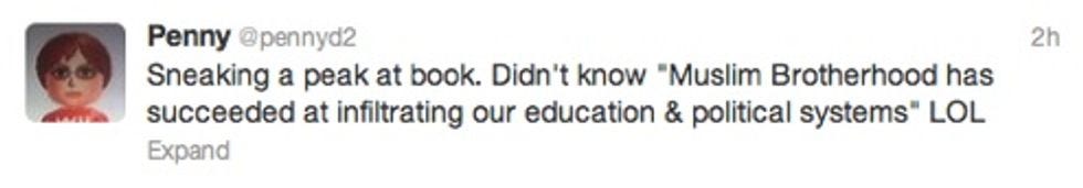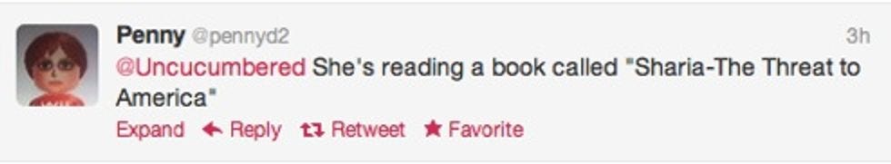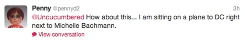 Well doesn't this just appear to be a promising comedy setup? Let's just end the tension right now and tell you in advance, it is. But you knew this: It is a universal law of Reason that because Michele Bachmann does not believe in it, even seemingly mundane activities like Michele Bachmann sitting on an airplane next to a person with a Twitter account must bear comedy fruit. Today's episode (which begins after the jump) answers the question, "What is Michele Bachmann reading these days?" Hint: IS CREEPY SHARIA CREEPING?