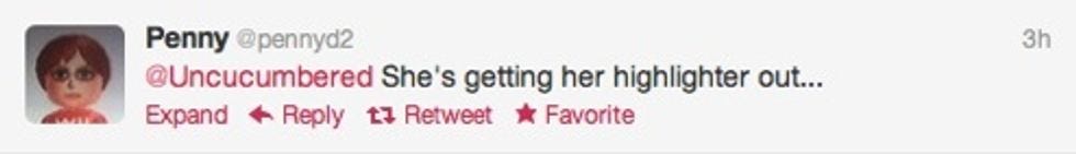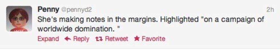 "Penny" identifies this group as the weirdo cabal behind the book Bachmann is reading, but what we notice more than anything is that she sounds so focused! Notes on napkins! It's nice to know that she at least works hard at all that crazy. [ Twitter ; thanks to Wonkette commenter "Limeylizzie"]