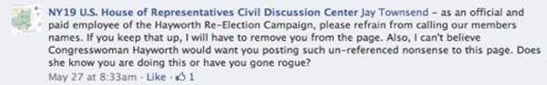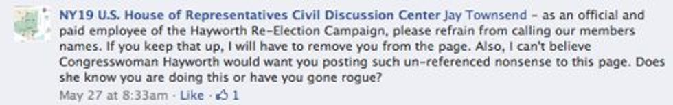 Here he is, it is this guy pictured at left. This is Jay Townsend, campaign spokesman for GOP Rep. Nan Hayworth, the communications genius who managed to join a seemingly innocuous Facebook comment thread about falling gas prices on the "NY19 U.S. House of Representatives Civil Discussion Center" page and somehow abuse enough inhalants at such breakneck speed that he got around to posting the actual words "Let’s hurl some acid at those female democratic Senators who won’t abide the mandates they want to impose on the private sector" by only the fifth comment down. We mention the inhalants only because we assume that a professional campaign spokesperson would have to be operating in a state of temporary brain death to give his opponents such a large, free gift.