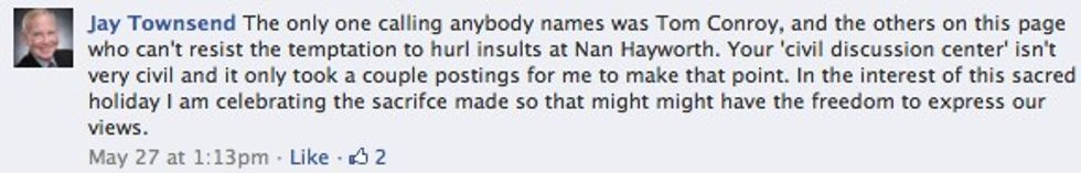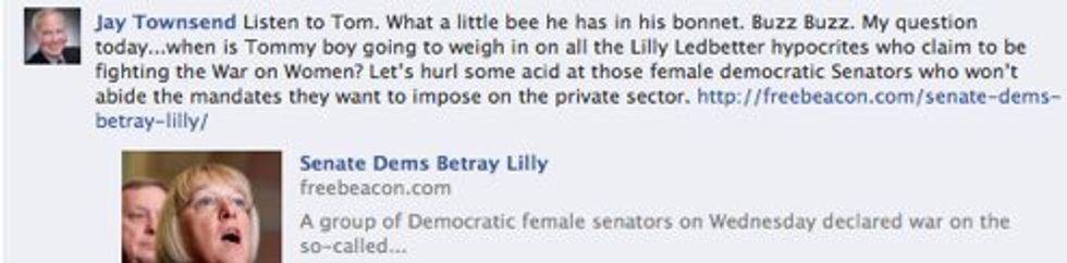 The comment is still there, on Facebook. Jay Townsend either loves his proposal too much to delete it, or Jay Townsend is the only professional campaign spokesman in America who has not yet figured out how to delete Facebook comments: