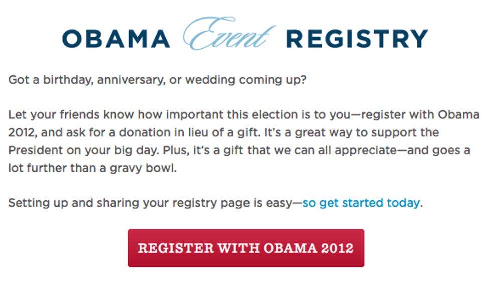 President Obama, that is his name, has come up with a brilliant new way to try to beat his opponent Mitt Romney at money-making, despite the fact that they seem to have more money than anyone would need to do anything, except maybe buy a Hawaiian island!!!!!! Isn't it strange that we have to pay people to prepare themselves to run the country for a relatively short time? Anyway, Obama is now suggesting that if you have a wedding, birth, or anniversary, or any old excuse for wanting your friends and family to pool together their unemployment and social security checks and buy you shit, instead of asking for Le Creuset pots and diapers and wine, why don't you just give the money to Barack Obama instead?