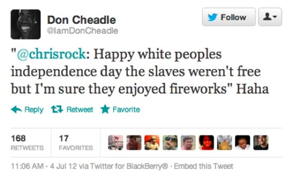 Because we hate ourselves, your Wonkette spent the early part of its Fourth of July Holiday surfing for wingnuts yelling at unpatriotic celebrities criticizing the Birth of America. This thing, "Shameful: Aaron Sorkin, Left celebrate Independence Day by slamming America; Update: Chris Rock joins in: ‘Happy white peoples independence day’; Don Cheadle laughs along; Zach Braff piles on," really hit the spot. Did you know that Chris Rock and Don Cheadle are true traitors for noting that the enslavement of black people was very much "a thing" during the signing of the Declaration of Independence?