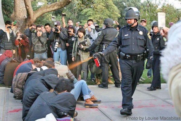 “Welcome to ESPN’s coverage of Occupy. The cops have clearly been training in the offseason. They have a whole new playbook. Wait, some of the protesters have button-hooked over to the unmanned side. They’ve jumped a barricade. The police have pulled out pepper spray! But the protesters have masks! They could – go – all – the – way – No! No! The police just beat the hell out of the protesters’ star player, an 85 year-old Granny for Peace. She’ll have to be carted off the field. Looks like the men in the blue will take this round, successfully protecting the criminal activity of the men in the ivory towers. Join us back here tomorrow when the protesters try a new tactic of aggressive singing and the cops try out tasers!”