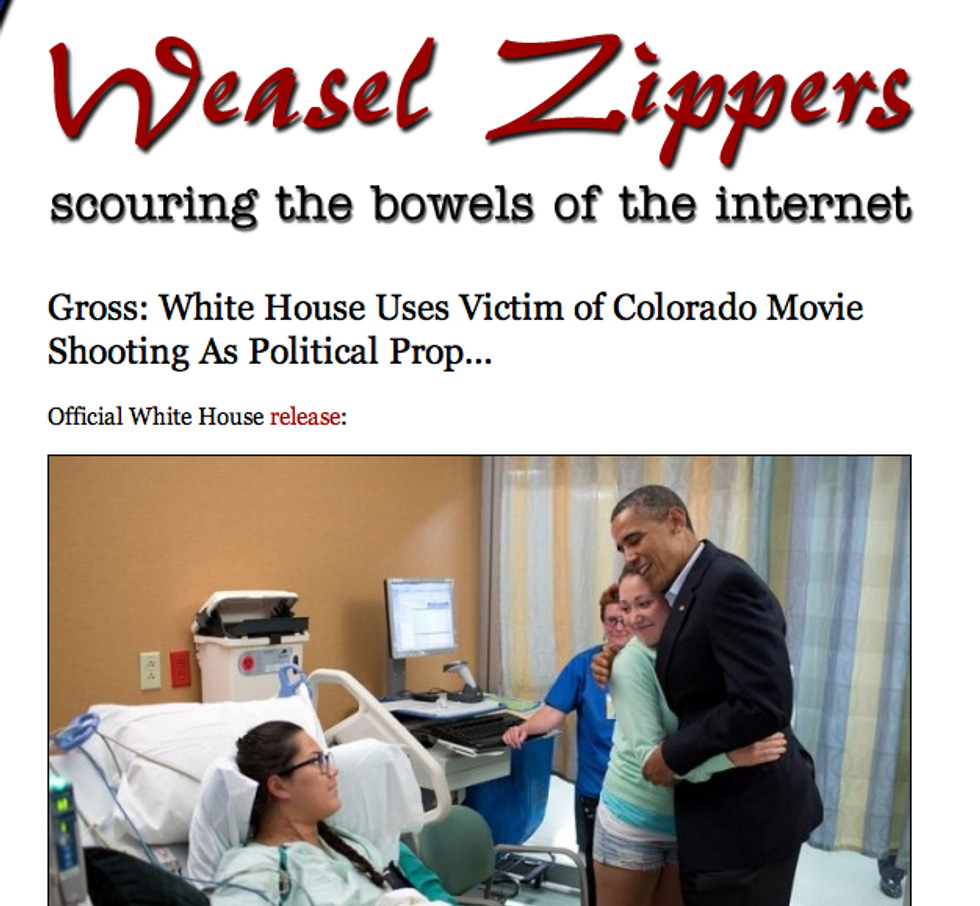 Do you see that picture, above, of Barack Hussein NOoBaMA hugging a white woman who saved her friend's life in the Aurora massacre? Yes, Stephanie Davies stayed with her friend Allie Young, who'd been shot in the neck, and kept applying pressure to the wound even after her friend told her to run. What do you suppose the wingnuts have to say about Barack Obama going to visit wounded people in the hospital? Do you suppose they have an opinion? We bet they are all saying, "oh, that's nice, Barack Obama went to the hospital and made some people feel better," we bet that is what they are probably saying. They could even have made a joke, like, guess he didn't needΒ 110Β fundraisers in six months har har. Sure, they could have said that! Let us find out the answer to this important question, after the jump!