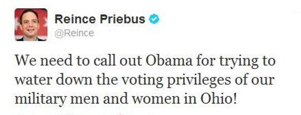 In other election-stealin' news, GOP chair Reince Priebus weighed in on the question of early voting in Ohio. (As we all should know by now, the reality is that until last year, all Ohio voters could vote early. Then the GOP passed a bill taking away early voting for everyone but members of the military. Now the Democrats are suing to get early voting reinstated for everyone, and the GOP is claiming that the Dems hate the military and don't want them to vote. Yes, exactly.) Now that fact-checking stories are making it impossible for Republicans to claim that Ohio Dems are trying to restrict military voting, Priebus found a new way to depict returning early voting to everyone as a slap against The Troops: