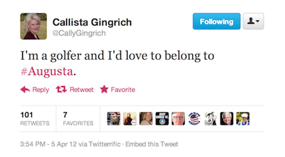 Ahh, so now we know why lying war monster Condolleezza Rice was going around giving wingnut speeches about socialism and such-like. It wasn't about getting on the presidential ticket -- who even wants that? -- it was about becoming the first female member of August National golf club, a goal that she attained today. She, along with Darla Moore, an insanely rich finance lady, can now navigate the lush fairways of America's finest golf course at their leisure without a male Fortune 500 CEO escorting them. Now it's just the other 99.9% of us schmucks who will never be able to play this course once in our lifetimes. Hooray!