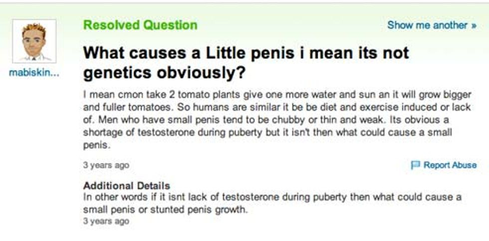 You guys, this explains SO MUCH about his career and burning hatred of women! And thank goodness he figured out the key to his problem, because it's now clear that he's been looking for information on some dubious websites, like the notoriously hilarious Yahoo! Answers :