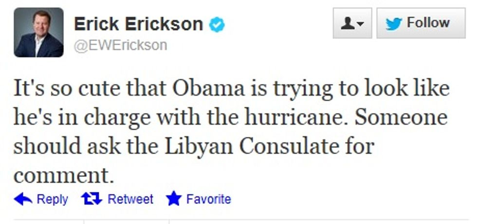 Guys, you will not believed this, but Joel Pollak, the genius non-email-reading editor in chief at Breitbart.com is very unhappy about the hypocrisy of the left! You see, Mr. Pollak has noticed that even though there were a number of jokes about Hurricane Isaac and the GOP Convention blowing into Tampa, Florida, at the same time, very few people are making political jokes about Hurricane Sandy. In a veritable storm surge of butthurt, he calls attention to this very revealing lack of dumb jokes: