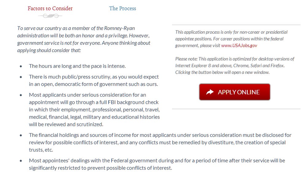 O hai Romney transition website developer! Did you know that if you have a website you do not yet want people to see yet, you can hide it? Like, you could put up a splash page that says "coming soon," with kittens with googly eyes, or you could just have it in development pages and not actually published to the Internet! We do not blame you, web development is hard! You know: UNLESS IT IS YOUR JOB TO DEVELOP THE WEB. Here are some screenshots of the Romney transition website, which unaccountably was live for the whole Internet (but especially Taegan Goddard at Political Wire ) to see! It was here an entire day after Miffed "47 percent" Romney shit the electoral bed! We especially like the ones we are gonna show you after the jump!