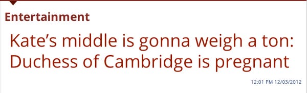 Daily Caller entertainment editor Taylor Bigler, as if that is even a name, is there anything going on in the world today that you might like to weigh in on? Oh, we guess you did right there, up above, in that screenshot. "Kate’s middle is gonna weigh a ton: Duchess of Cambridge is pregnant." Can we make a stupider headline than this? Probably not, right? We can but try.
