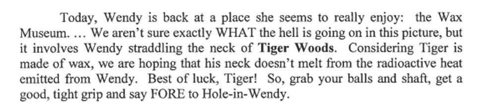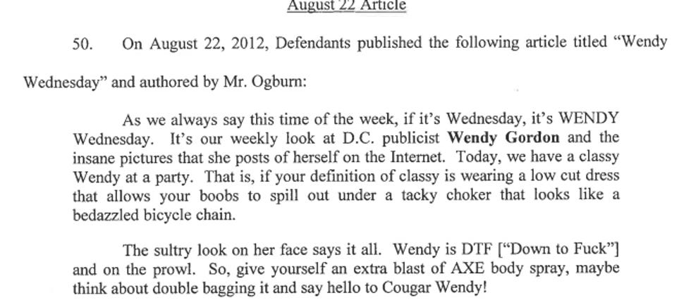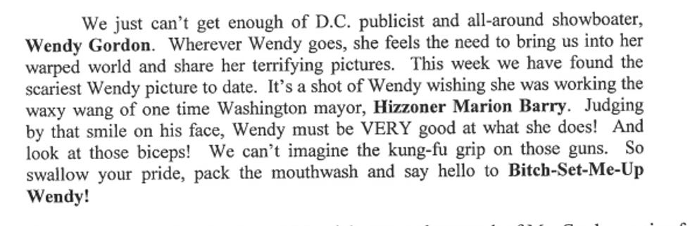 If anything, Wendy Gordon's lawyers are better at satire than are FishbowlDC and Betsy Rothstein. Examine this piece of evidence, if you will: