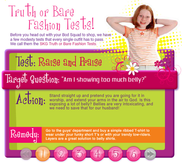 Wonkettians that are in possession of children, specifically girl children, specifically 8, 9, 10-year-old girl children: have you been worried that your small girl child is just too...revealing? A little bit too...not-modest? You're in luck, denizens of Wonkettia, because now you have a resource, complete with helpful Q&A , to make sure that your 8-year-old isn't a slutty slut slut. Yes indeed, God has a secret plan for your girl, who should keep everything secret so she gets to learn God's secret plan. Is that right? We think that is right. You know what? We'll let the site explain:
