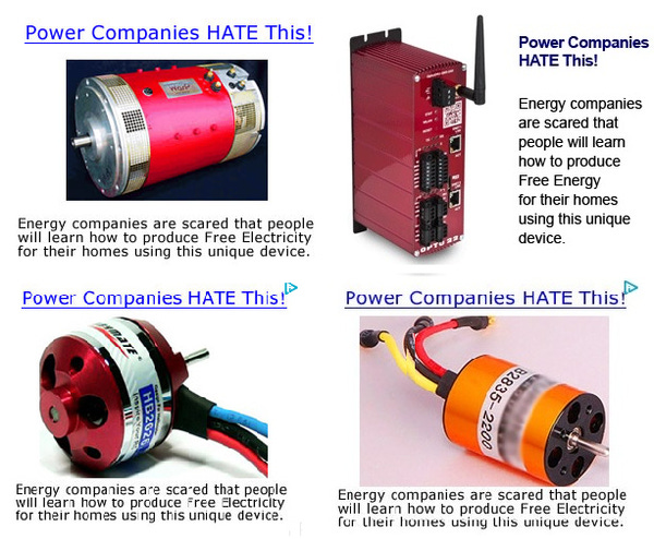 And then there's the counter-scammers: One of the top Google results for the phrase "power companies hate this" brings up a fairly good discussion of problems with the Power4Home products -- but it runs on a website that's pushing magnetic-powered perpetual motion machines , which reminds us of Pat Robertson warning his viewers not to fall for "scamsters in religious garb."