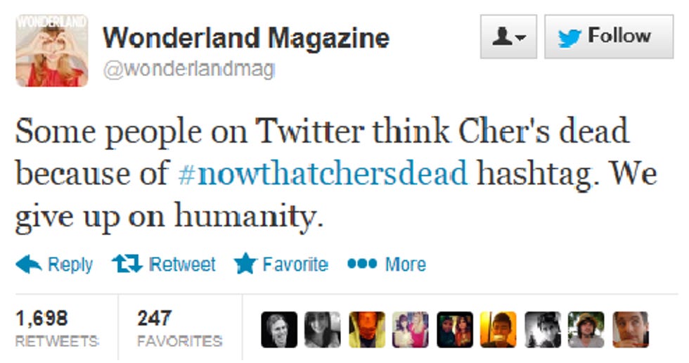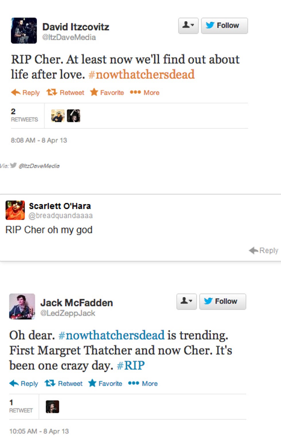 Thatcher's Dead; Twitter Users Worried That Cher's Dead